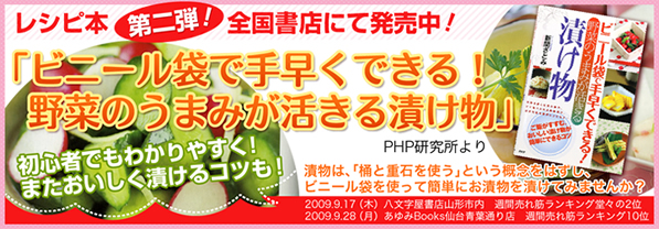 この電話がきっかけで、翌年2009年(平成21年)9月に私の代表作「ビニール袋で手早く出来る野菜のうまみが活きる漬け物」全国出版となりました。